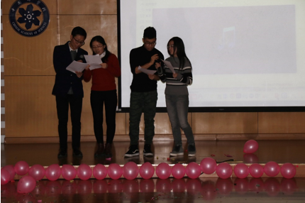 第一个活动环节是游戏——《演员的诞生》。两位同学表演主持人事先准备好的词语内容,由一名同学猜,猜对多的一队胜利。活动期间,有些队伍配合默契,猜词又准又快,临时组队的失去了最后的名次。值得一提的是,现场有些老师和学生虽然是第一次参加配合,但是配合却无比默契,并取得了第二名的好成绩。