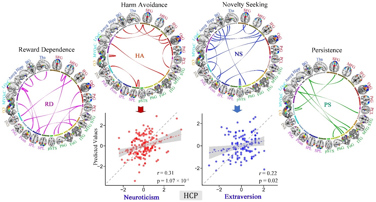 人类的气质个性 (temperament) 作为一种基本的内在特质,是由包含认知、情感和行为在内的多维属性组成的,它影响着人们在生活中方方面面的表现,如工作积极性、社交关系、社会态度等。其中回避伤害性(HA)、探求新奇性(NS)、奖赏依赖性(RD)和坚持有恒性(PS)是四种常见的人格气质指标,反映了人们在特定环境中对危险、新奇以及奖励等刺激的自发反应。已有研究显示,人类的气质性格受遗传因素的影响,并与部分精神疾病的风险有着密切联系。目前,基于大脑功能连接已经开展了对于多种认知指标(如流体智力、注意力等)的个体化预测研究;然而,基于脑功能连接对上述人格气质评分进行个体化定量预测的研究仍鲜有报道。