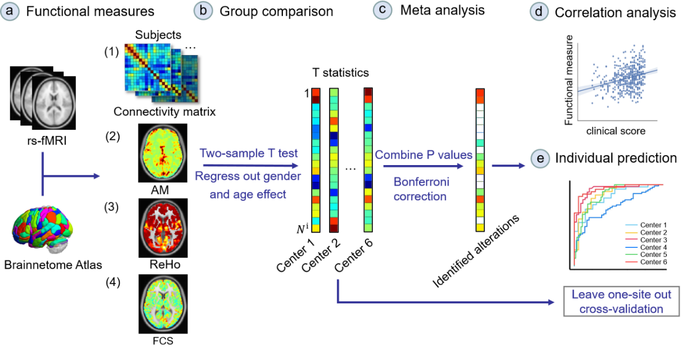 阿尔茨海默病(Alzheimer Disease, AD),是一种不可逆的神经退行性疾病。 大量基于功能磁共振影像的研究提示AD可能是一种失连接综合征。但是由于缺乏大样本、多站点的数据集交互验证,迄今为止与AD脑功能活动、脑连接的异常模式还没有得到一个清晰一致的结论,脑功能活动是否可以作为AD的早期影像学标记也有待进一步验证。