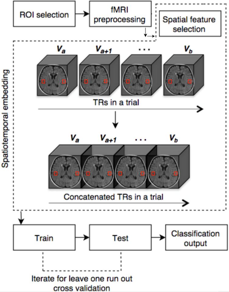 Figure 1. Graphical illustration of data processing. The top row indicates the preprocessing steps employed in this study. Spatiotemporal embedding is shown in the dotted box, which involves concatenating the outcome of fMRI data feature selection (voxels inside red squares are symbolic representation of bilateral IT after feature selection), for fMRI volumes `a` through to `b`. Each 3D cube is a symbolic fMRI volume. The bottom row illustrates the learning steps. |