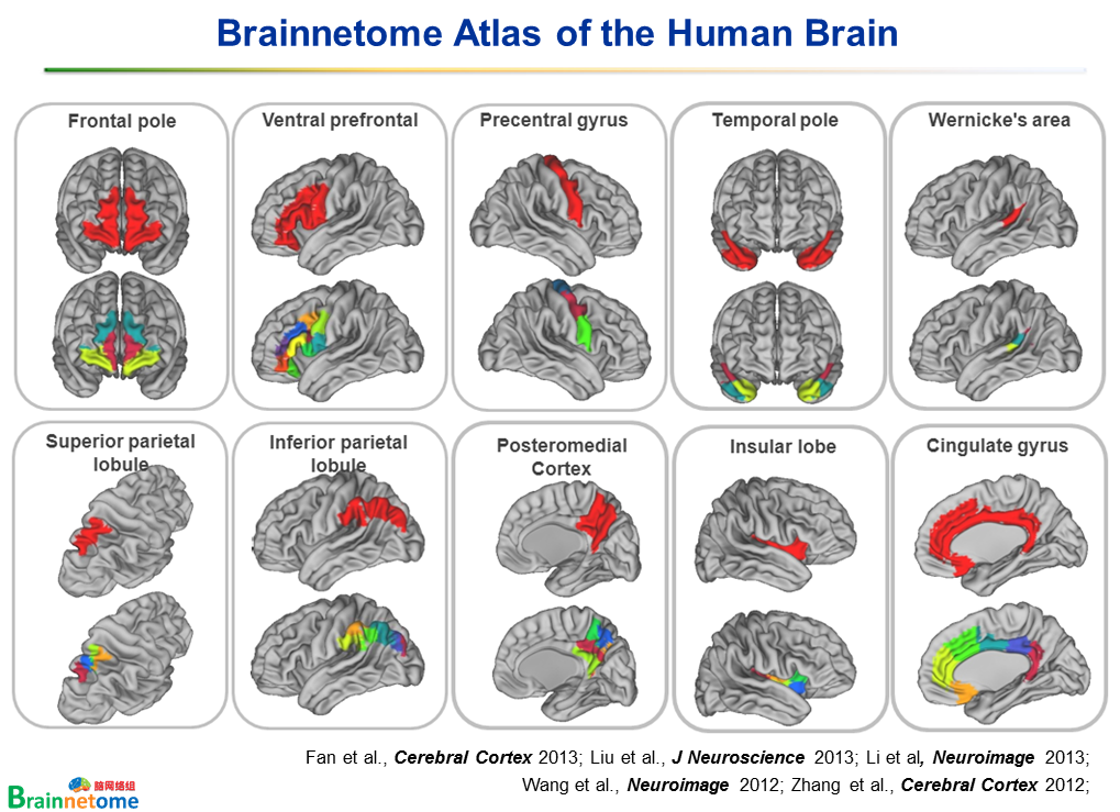 图1. 利用多模态磁共振数据获得的连接信息对额极、腹侧额叶皮层、中央前回、颞极、威尔尼克区、顶上小叶、顶下小叶、内后皮层、岛叶以及扣带回等功能复杂脑区进行子区域划分的结果。