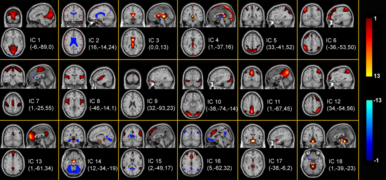 图1. 利用组信息指导的独立成分分析方法(GIG-ICA)得到的18个平均成分——Du and Fan, Neuroimage