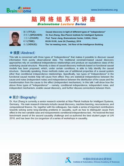 Dr. Kun Zhang is currently a senior research scientist at Max Planck Institute for Intelligent Systems, Germany. His main research interests include causal discovery, machine learning, neuroscience, and computational finance. He, together with his colleagues, has made a series of important contributions towards solving some long-standing problems in causality, such as how to distinguish cause from effect in the two-variable case and nonparametric conditional independence test. He received the best benchmark award of the second causality challenge and co-authored the best student paper at UAI 2010, and has been the (co-)organizer of a series of workshops in causality.