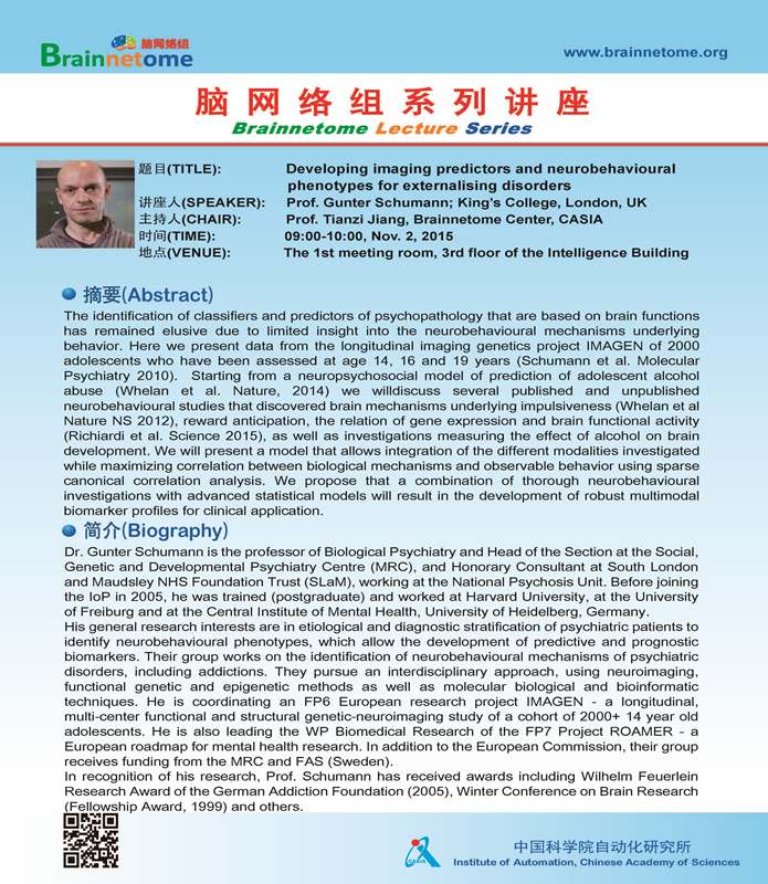 Speaker: Prof. Gunter Schumann; Institute of Psychiatry, Psychology and Neuroscience; King's College, London, UK
