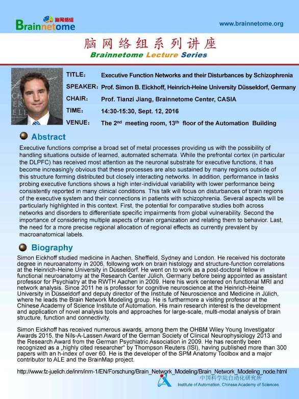 Prof. Simon B. Eickhoff's Lecture - Executive function Networks and their Disturbances by Schizophrenia