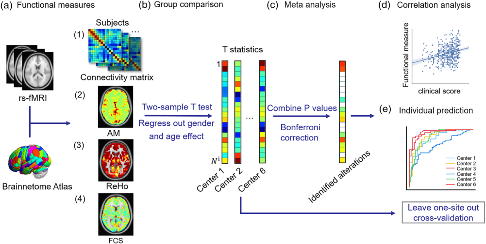 Figure. Schematicofthedataanalysispipeline.(a)Functionalmeasures(AM,ReHo,FCS)andtheconnectivitymatrixarecalculatedbased onBrainnetomeAtlas.(b)Atwo-samplettestwasperformedtoobtainthepvalueforeachfunctionalmeasureandconnectivityineachcenter aftercontrollingforageandgendereffects.(c)Themeta-analysiswasappliedtointegrateresultsfromsixcenters,andthesignificantlyaltered regionswereidentifiedaftermultiplecomparisoncorrection.(d)Then,thecorrelationanalysiswasperformedtoevaluatetherelationship betweenfunctionalmeasuresandtheclinicalscores.(e)Finally,leave-one-site-outcross-validationwasperformed.AM,theamplitudeoflocal brainactivity;FCS,functionalconnectivitystrength;ReHo,regionalhomogeneity |