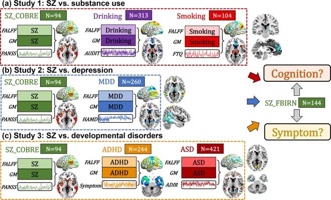 Figure. Flowchart of the study design. The study design includes three sections: (a) Study 1: SZ_COBRE vs. substance use, (b) Study 2: SZ_COBRE vs. depression, (c) Study 3: SZ_COBRE vs. developmental disorders. First, we identify specific symptom-associated multimodal components for COBRE SZ, drinking, smoking, MDD, ADHD and ASD groups separately. Then the common brain regions were determined by overlapping the derived symptomrelated components of different diagnostic groups versus COBRE SZ (Study 1–3). Finally, correlation analysis was performed to evaluate how these identified brain regions associate with particular cognitive or symptomatic measures in an independent SZ dataset (FBIRN), which also test the replicability of our findings. |
