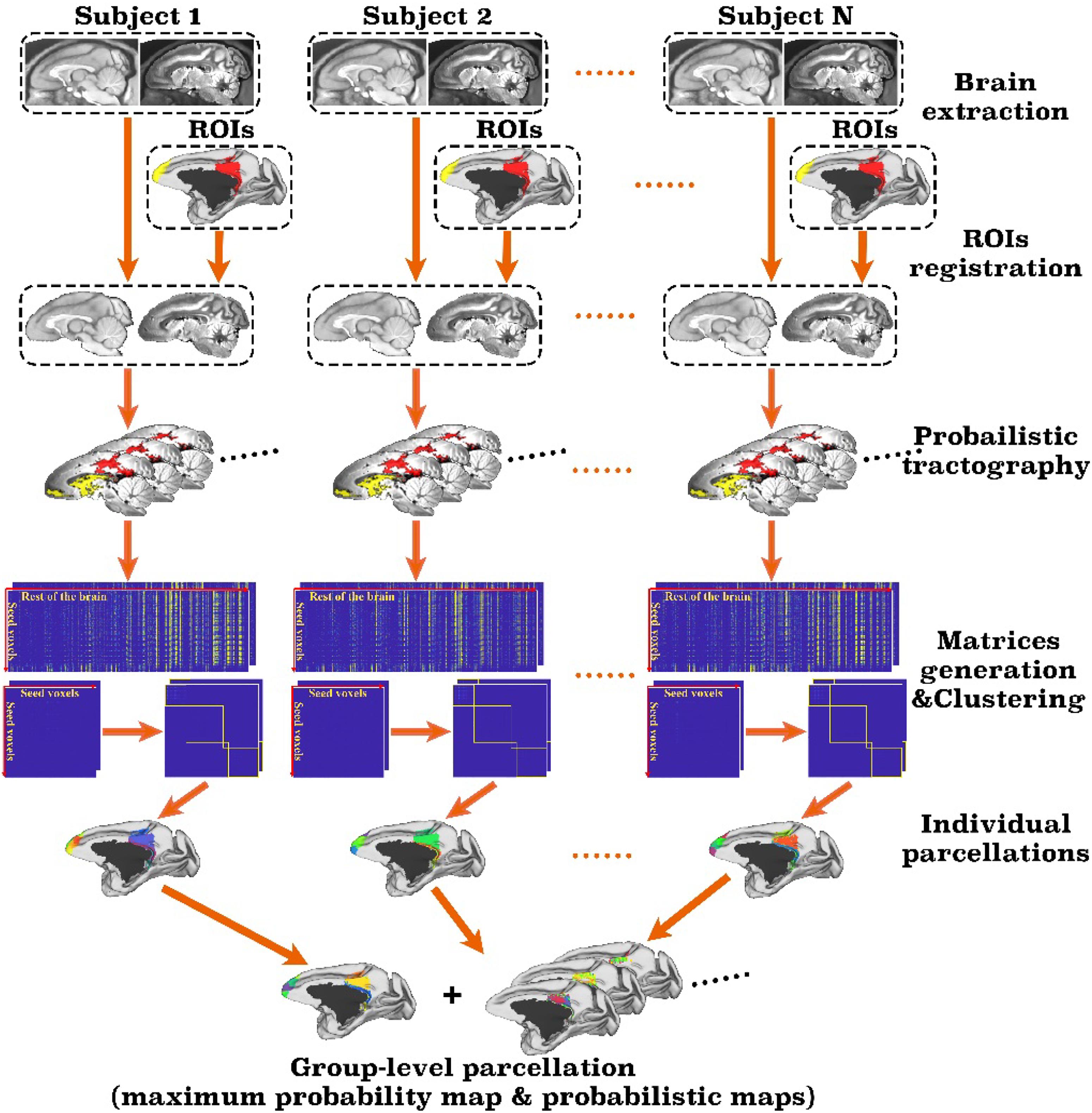 Figure 1. Framework of the MonkeyCBP toolbox. The processing steps of the pipeline mainly including brain extraction, registration, probabilistic tractography, and clustering. First, the technique of brain extraction for monkey MRI data was performed; then based on T1w and diffusion tensor images of the same subjects, two defined regions of interest (ROIs), including the right posterior cingulate cortex and the bilateral frontal pole, are parcellated simultaneously. After pipeline processing, the parcellation results at both individual level and group level with a maximum probability map and probabilistic maps of each subarea of the right posterior cingulate cortex and the bilateral frontal pole are generated. |