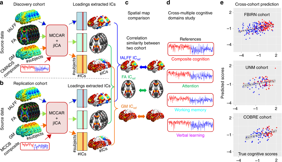 Cognitive impairment is a feature of many psychiatric diseases, including schizophrenia. Here we aim to identify multimodal biomarkers for quantifying and predicting cognitive performance in individuals with schizophrenia and healthy controls. A supervised learning strategy is used to guide three-way multimodal magnetic resonance imaging (MRI) fusion in two independent cohorts including both healthy individuals and individuals with schizophrenia using multiple cognitive domain scores. Results highlight the salience network (gray matter, GM), corpus callosum (fractional anisotropy, FA), central executive and default-mode networks (fractional amplitude of low-frequency fluctuation, fALFF) as modality-specific biomarkers of generalized cognition. FALFF features are found to be more sensitive to cognitive domain differences, while the salience network in GM and corpus callosum in FA are highly consistent and predictive of multiple cognitive domains. These modality-specific brain regions define—in three separate cohorts—promising co-varying multimodal signatures that can be used as predictors of multi-domain cognition.