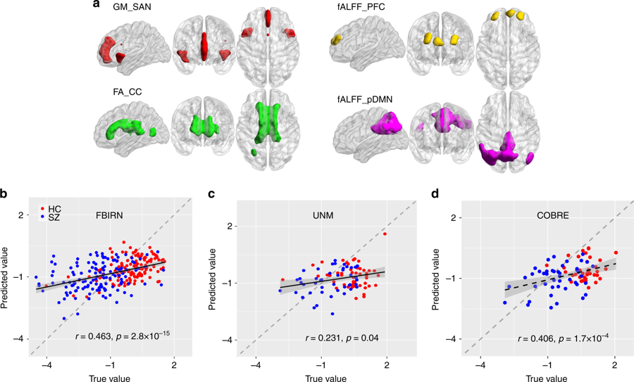 Fig.2 Identified multimodal neuromarkers and the predictability on composite cognitive scores across three cohorts
