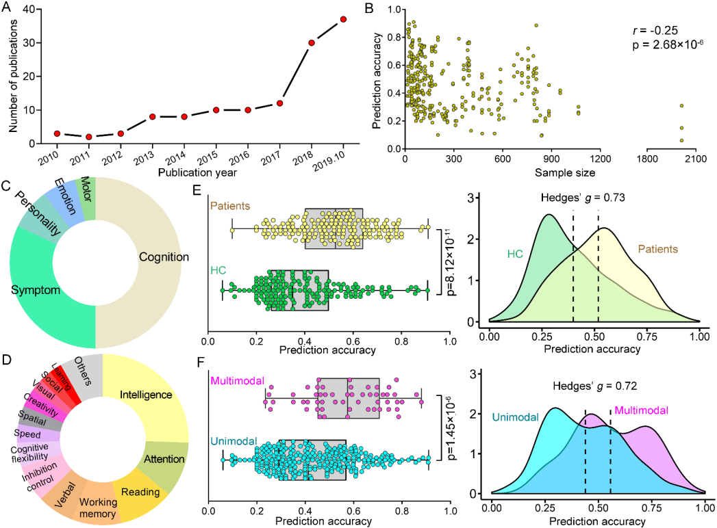 Figure.Visual summary of studies using regression-based machine learning approaches to predict continuous variables.(A) There is an obviously increasing trend in the number of papers published each year since 2010. (B) The overall prediction accuracy against the corresponding sample size used in the studies. (C) The type of behaviors of interest that are used as the target measures among all surveyed studies. (D)Cognitive metrics adopted in our surveyed studies. (E) Distribution of prediction accuracy for healthy subjects and patients with brain disorders shown as boxplot plot (left) and kernel density (right). (F) Distribution of prediction accuracy from studies using multimodal or unimodal data. |