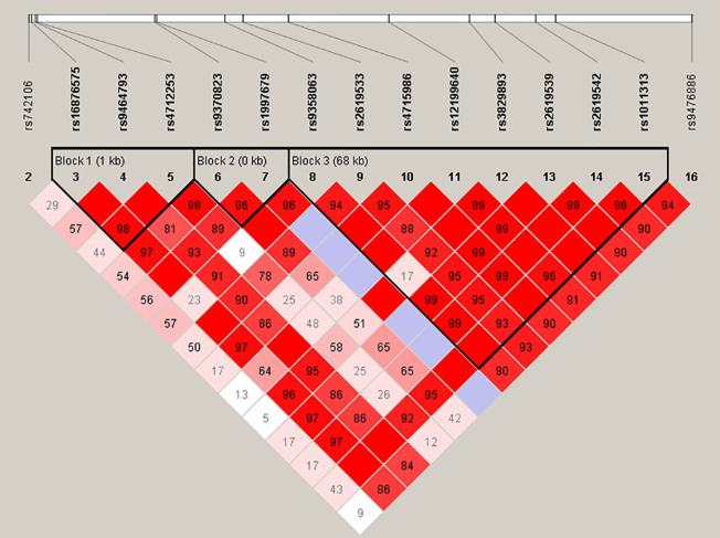 FIG.Haplotype block structure of the DTNBP1 gene in both SZ patients and HCs in stage 1 and 2 samplese combined. The index association SNP is represented by a diamond. The colors of the remaining SNPs (circles) indicate LD with the index SNP based on pairwise r2 values from our data.