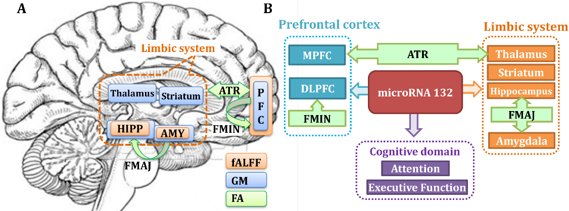 There is compelling evidence that epigenetic factors contribute to the manifestation of depression, in which microRNA132 (miR-132) is suggested to play a pivotal role in the pathogenesis and neuronal mechanisms underlying the symptoms of depression. Additionally, several depression-associated genes [MECP2, ARHGAP32 (p250GAP), CREB, and period genes] were experimentally validated as miR-132 targets. However, most studies regarding miR-132 in major depressive disorder are based on post-mortem, animal models or genetic comparisons. This work will be the first attempt to investigate how miR-132 dysregulation may impact covariation of multimodal brain imaging data in 81 unmedicated major depressive patients and 123 demographically-matched healthy controls, as well as in a medication-naive subset of major depressive patients. MiR-132 values in blood (patients4controls) was used as a prior reference to guide fusion of three MRI features: fractional amplitude of low frequency fluctuations, grey matter volume, and fractional anisotropy. The multimodal components correlated with miR-132 also show significant group difference in loadings. Results indicate that (i) higher miR-132 levels in major depressive disorder are associated with both lower fractional amplitude of low frequency fluctuations and lower grey matter volume in fronto-limbic network; and (ii) the identified brain regions linked with increased miR-132 levels were also associated with poorer cognitive performance in attention and executive function. Using a data-driven, supervised-learning method, we determined that miR-132 dysregulation in major depressive disorder is associated with multi-facets of brain function and structure in fronto-limbic network (the key network for emotional regulation and memory), which deepens our understanding of how miR-132 dysregulation in major depressive disorders contribute to the loss of specific brain areas and is linked to relevant cognitive impairments.