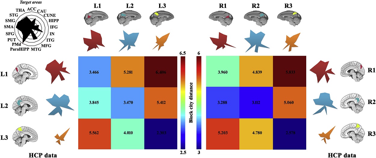 Figure. Human and macaque anatomical connectivity fingerprints for each precuneal (PCun) subregion were mapped using Human Connectome Project (HCP) data and macaque diffusion MRI data. The anatomical connectivity probability between each PCun seed region and each target was obtained for humans and macaques. Then, the anatomical connectivity was normalized and the mean connectivity probability was used to map the anatomical connectivity fingerprints. The block-city distance was used to calculate the similarity between the fingerprints of each PCun subregion in humans and macaques. Anatomical connectivity fingerprints identified correspondent PCun subregions in humans and macaques.